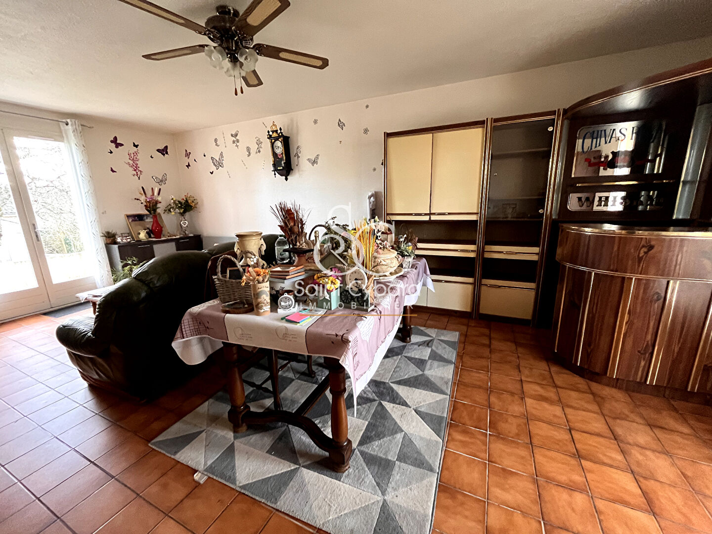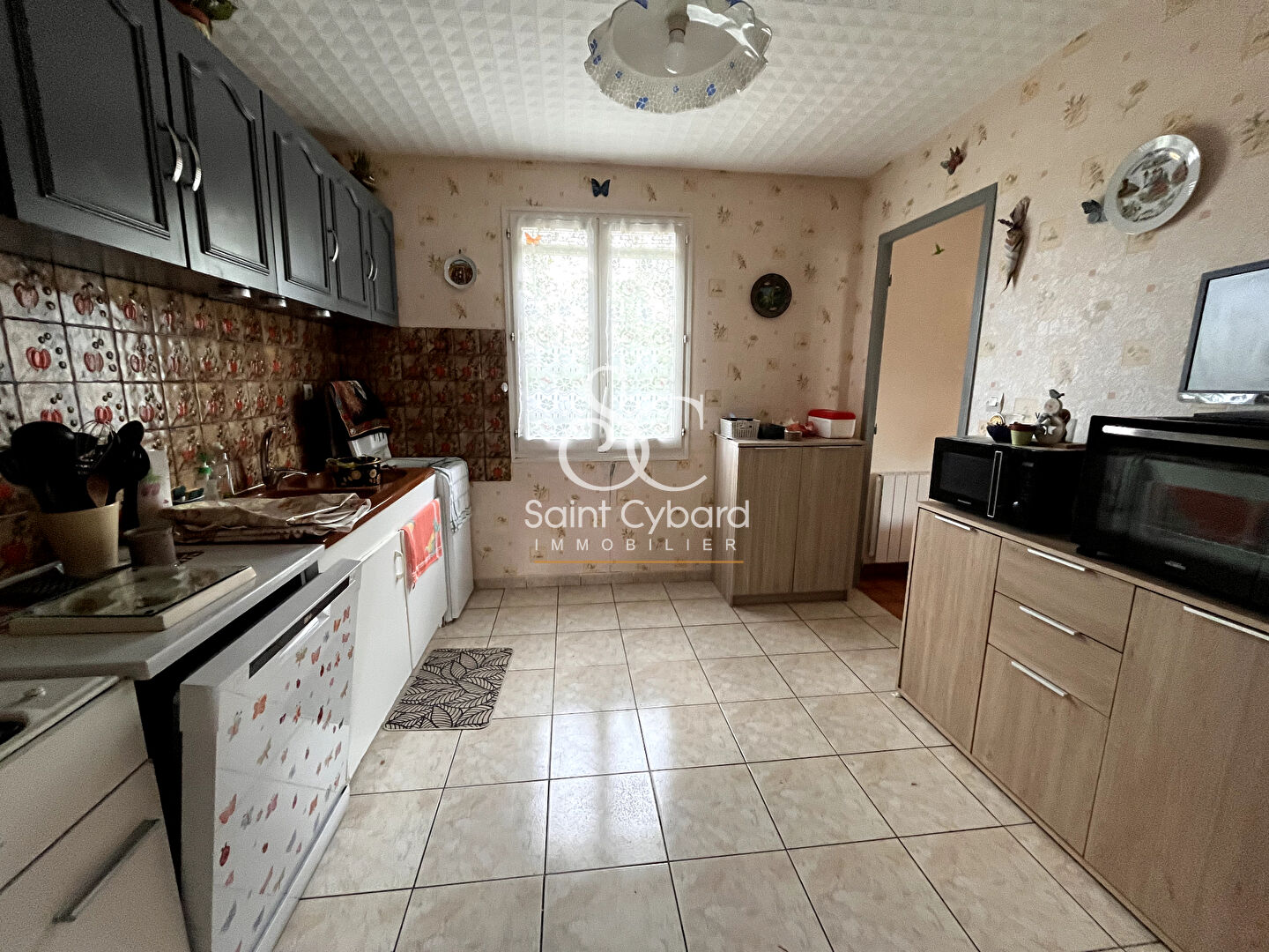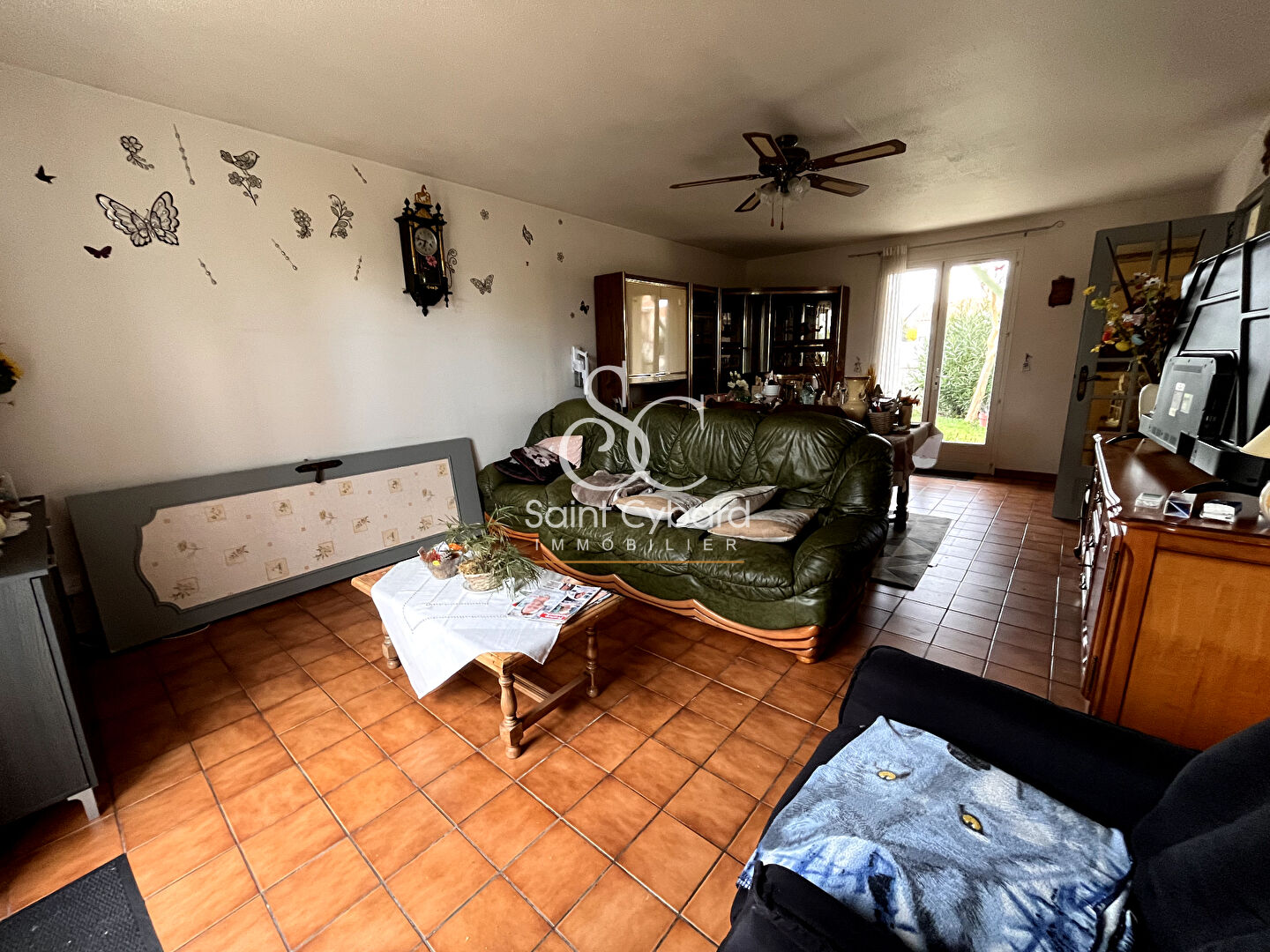 L'entrée dessert un séjour avec ouverture sur le jardin et une cuisine aménagée.